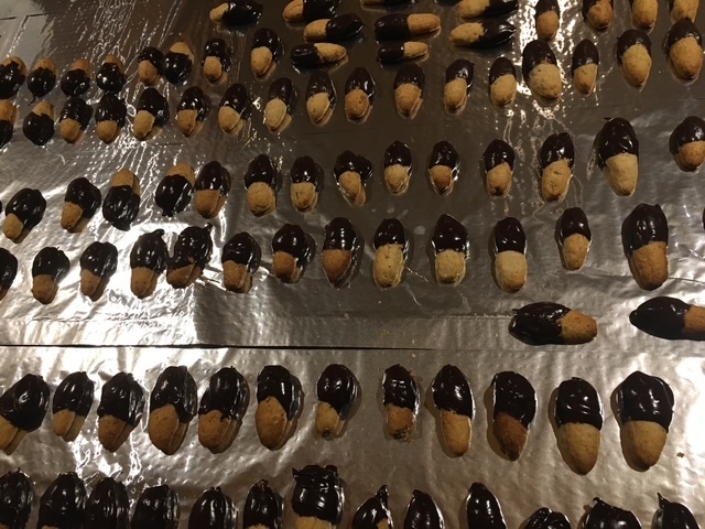 Dès que les premiers biscuits sont prêts, mes enfants – mes testeurs officiels – viennent déguster les fournées. Chaque fournée passe par un contrôle qualité rigoureux avant d’être validé. Les biscuits, un peu trop brûlés, cassés, ou avec trop de glaçage ou encore qui sont tombés dans le chocolat fondu disparaissent mystérieusement… disons qu’ils trouvent rapidement preneur ! Autant dire que ce week-end-là, l’équilibre alimentaire passe un peu au second plan.